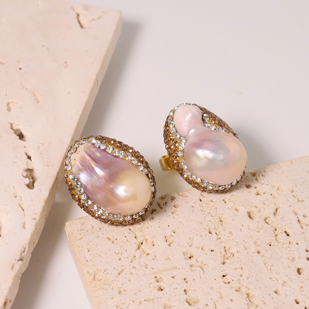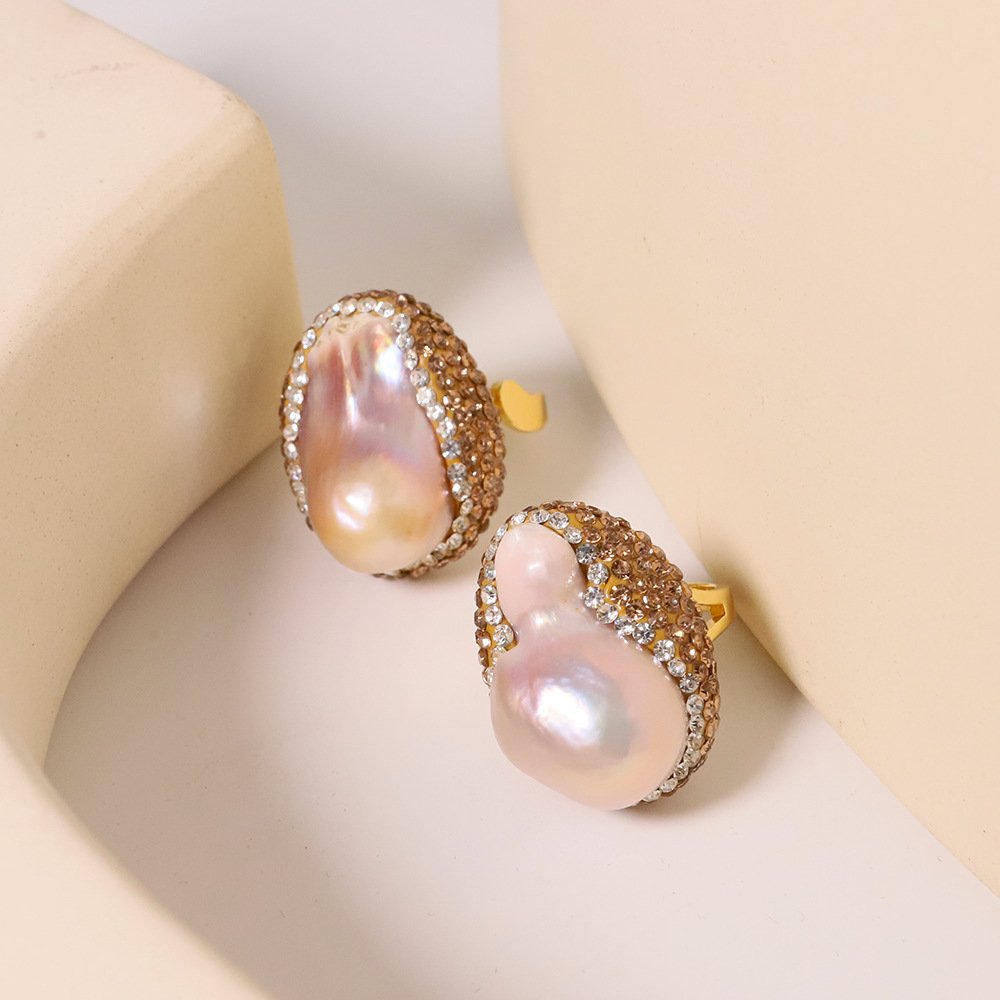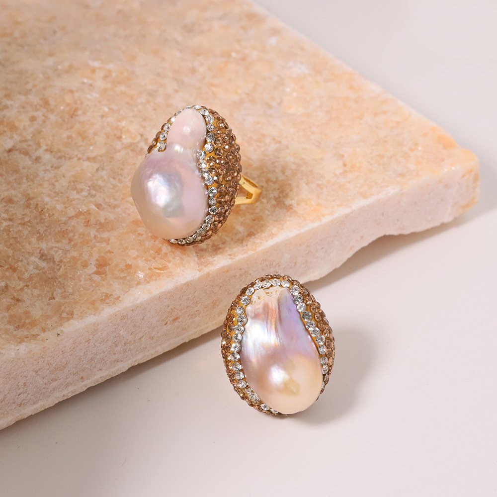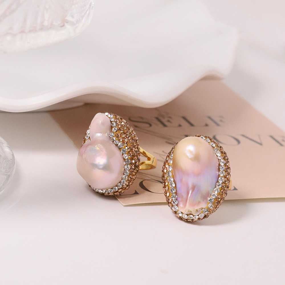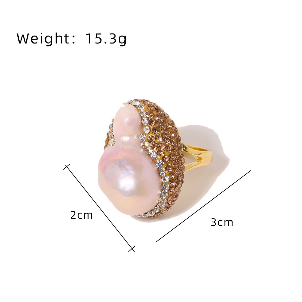 The main stone is a natural Baroque pearl, with a lustrous iridescent sheen on its surface. The band is made up of champagne-colored diamonds and white diamonds, creating a gradient bezel effect. The metal edges are sandblasted, and the overall craftsmanship combines micro-set and hand-polished techniques.