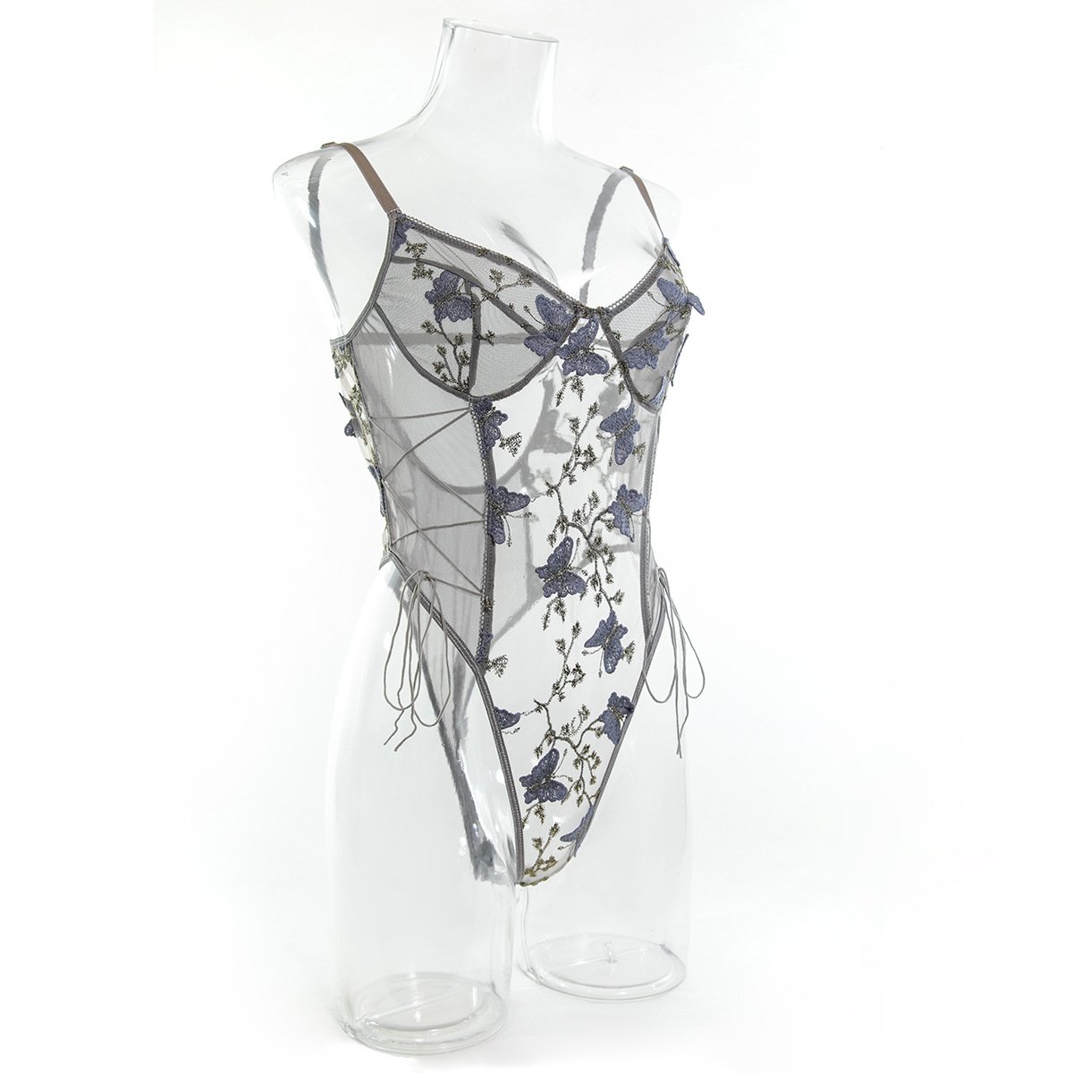 Embrace romance with our Butterfly Floral Embroidered Sheer Mesh Bodysuit. Featuring delicate butterfly and floral embroidery on sheer mesh, this lingerie piece exudes elegance and allure. The lace – up sides add a touch of playful sensuality, allowing you to adjust the fit to your liking. Crafted with soft, skin – friendly fabric, it hugs your curves beautifully while ensuring comfort. Perfect for special moments or when you want to feel effortlessly glamorous, this bodysuit blends artistry and seduction in one stunning design.