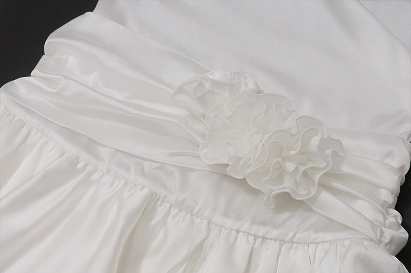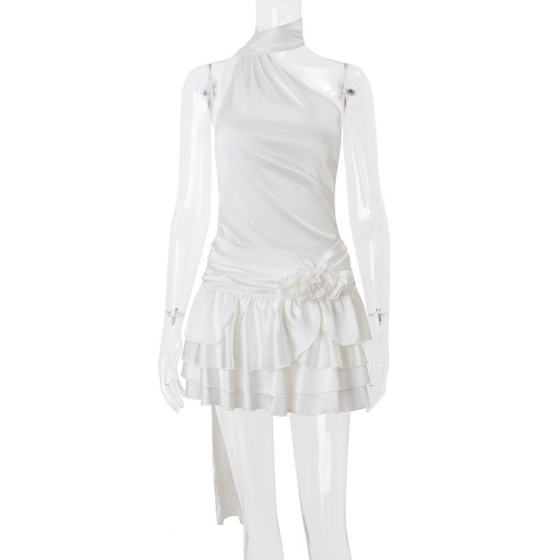 This dress features a French one – shoulder halter design. The satin fabric has a high – end luster, showing elegant texture. The 3D floral waist – cinching design at the waist highlights the slender waistline, and the ruffled skirt has a flexible layering. Combining unique tailoring and exquisite details, it is an eye – catching choice for parties, dates or light – luxury occasions, easily creating an elegant celebrity – style look.