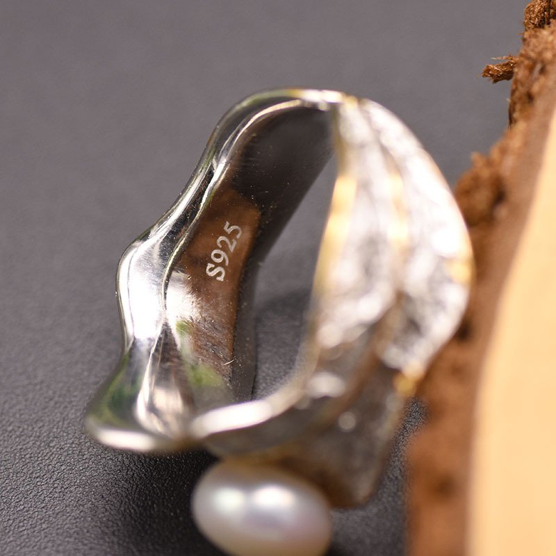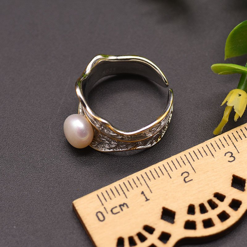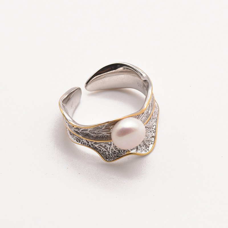 This silver-gold pearl ring features an antiqued silver base with retro carved texture, gold edging for added depth. And a central natural pearl to soften the cool tone. Its flexible open band fits various finger sizes, merging beauty and practicality.