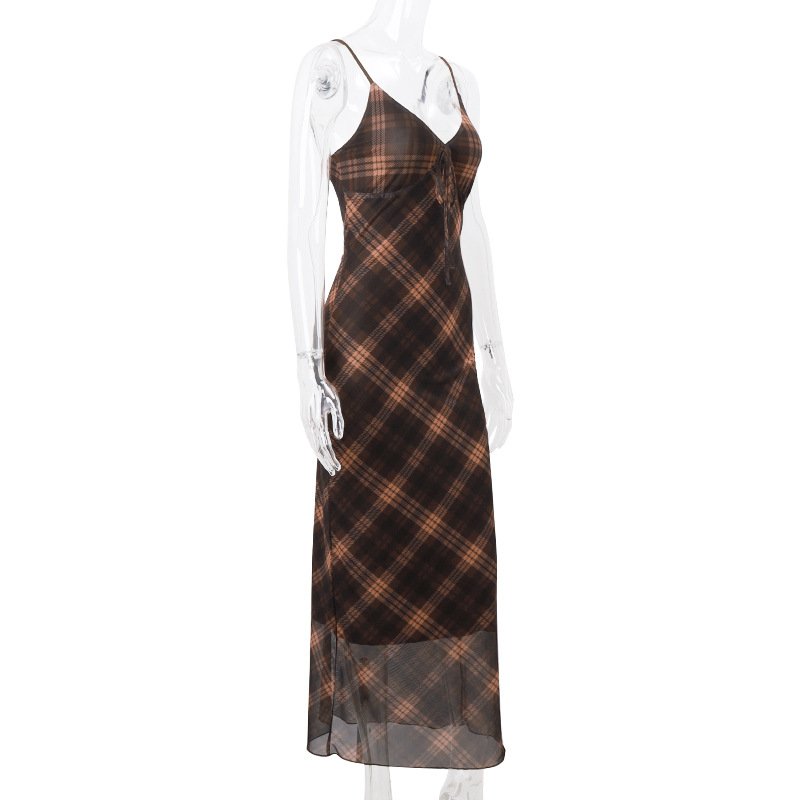 Retro Plaid Spaghetti Strap Maxi Dress, Deep V Tie Waist Slimming French Elegant Dress