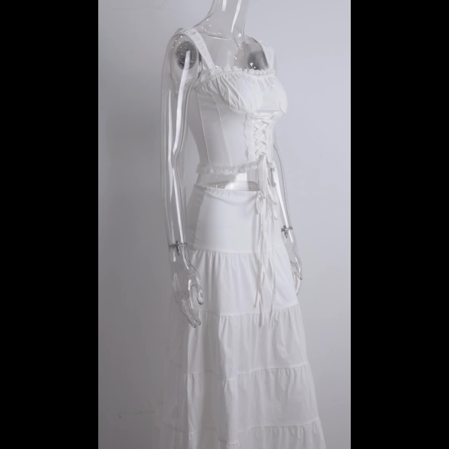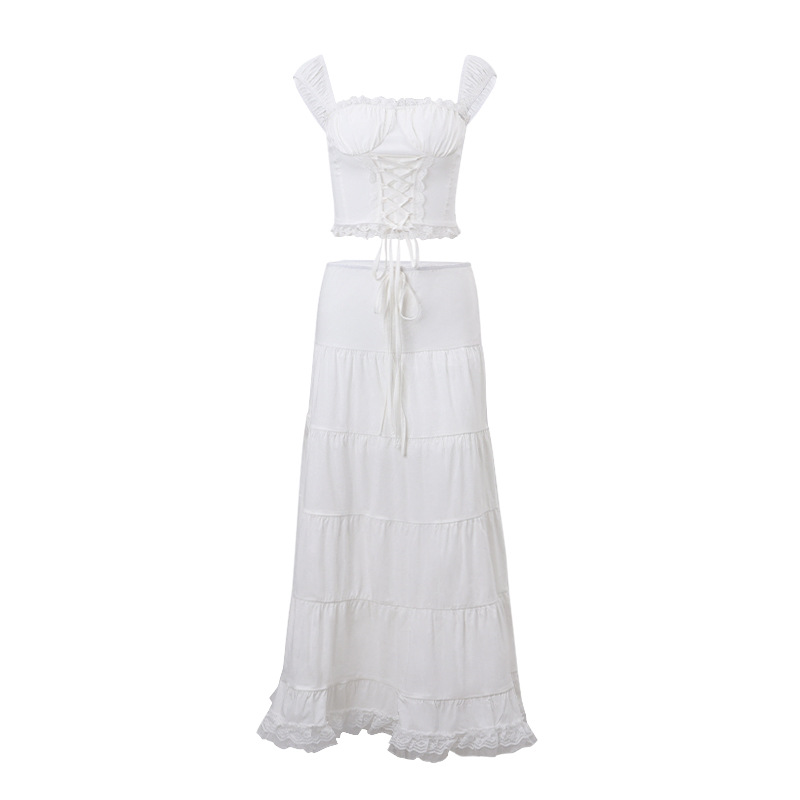 Summer Dress Women’s French Square Neck Strappy Top with Lace Insert and Half Skirt Vacation Style Set for Women