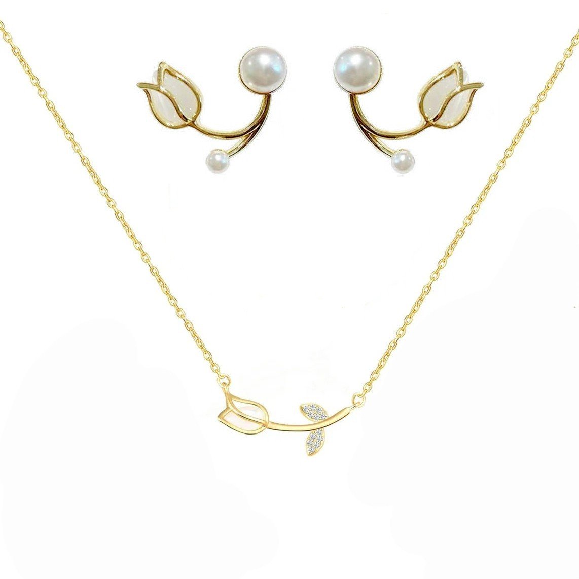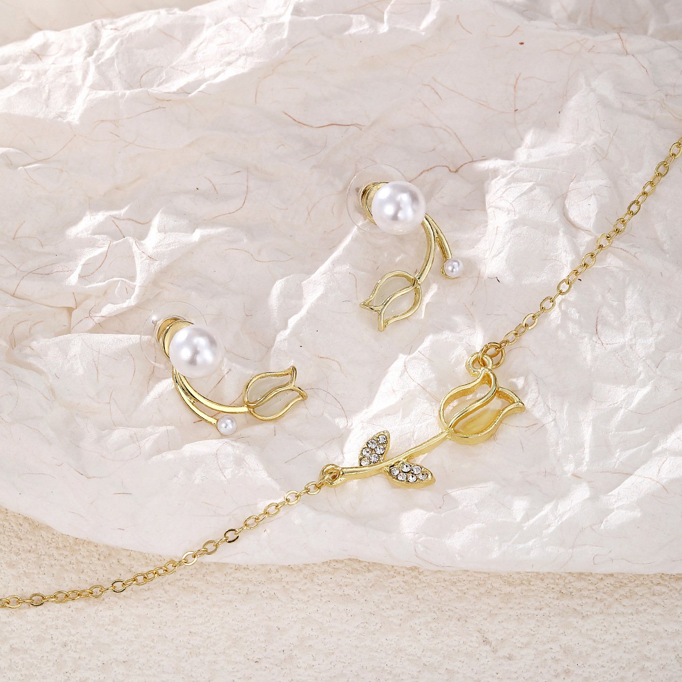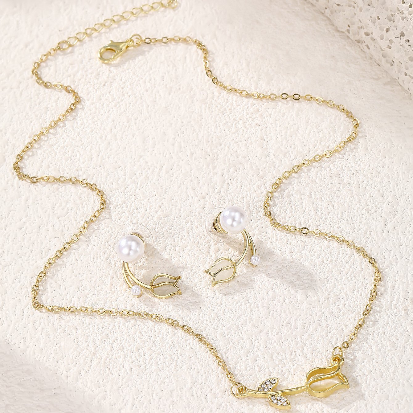 Add a touch of floral elegance to your look with this tulip – themed pearl jewelry set! It features a delicate gold – tone necklace with a tulip pendant adorned with small crystals, and matching earrings with charming tulip designs and lustrous pearls. Crafted with attention to detail, this set is ideal for elevating both casual and dressy outfits. Suitable for the fashion tastes of the European, American, and Australian markets, it’s a wonderful choice for daily wear or special occasions like parties.