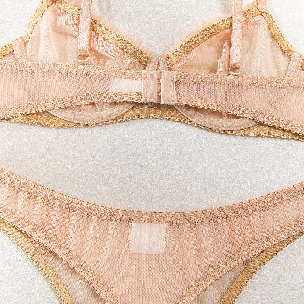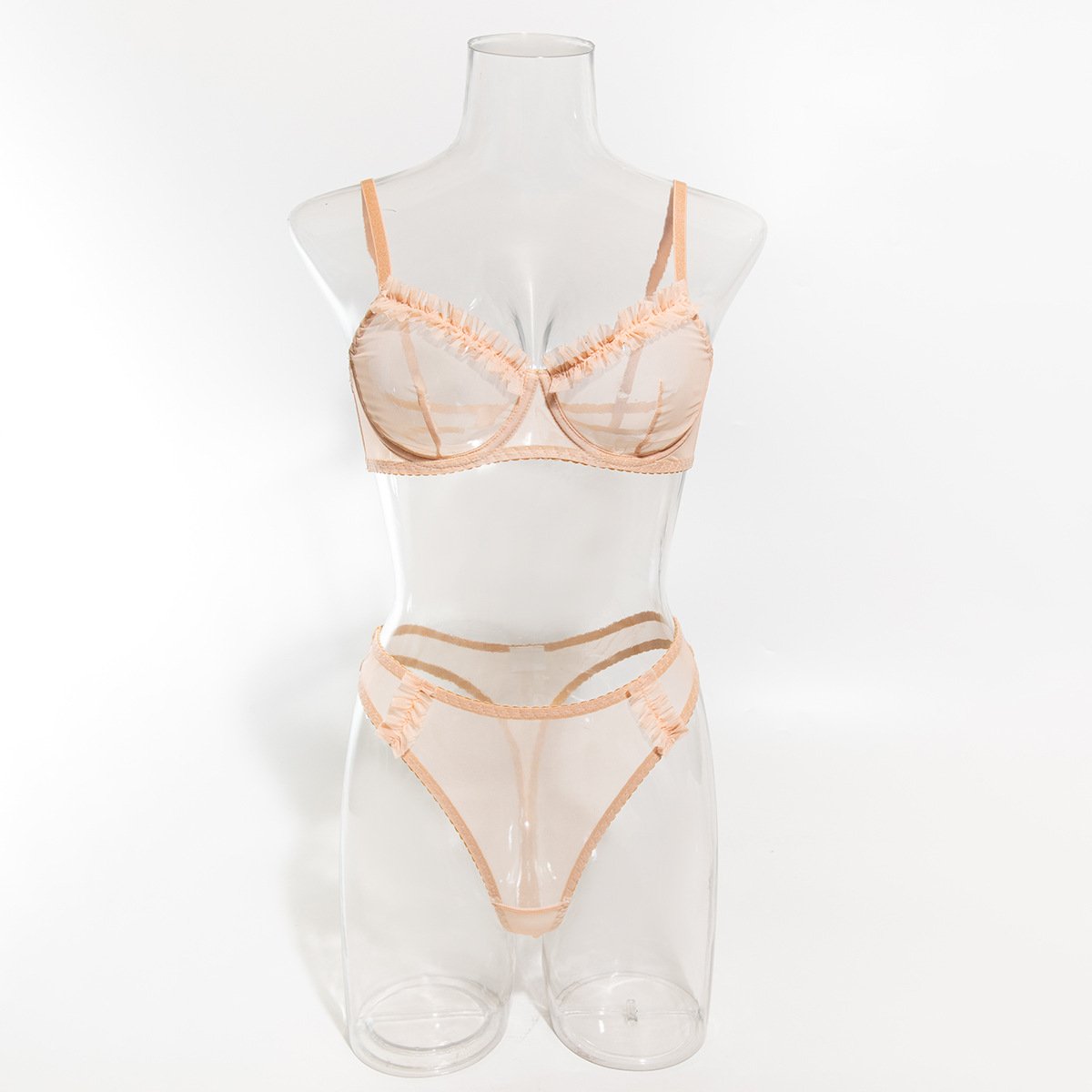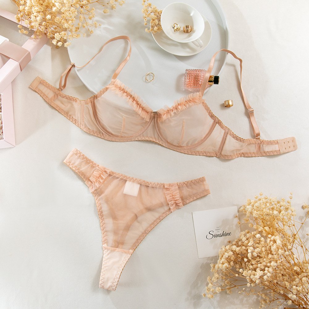 Indulge in elegance with our Sheer Mesh Lingerie Set. Featuring a delicate nude hue, this set combines sheer mesh fabric with charming ruffled accents for a romantic and alluring look. The bra offers gentle support and a flattering silhouette, while the matching thong completes the sophisticated ensemble. Crafted with soft, breathable materials, it ensures comfort throughout the day or night. Perfect for special occasions or when you want to feel effortlessly glamorous, this lingerie set brings a touch of timeless beauty to your intimate wardrobe.